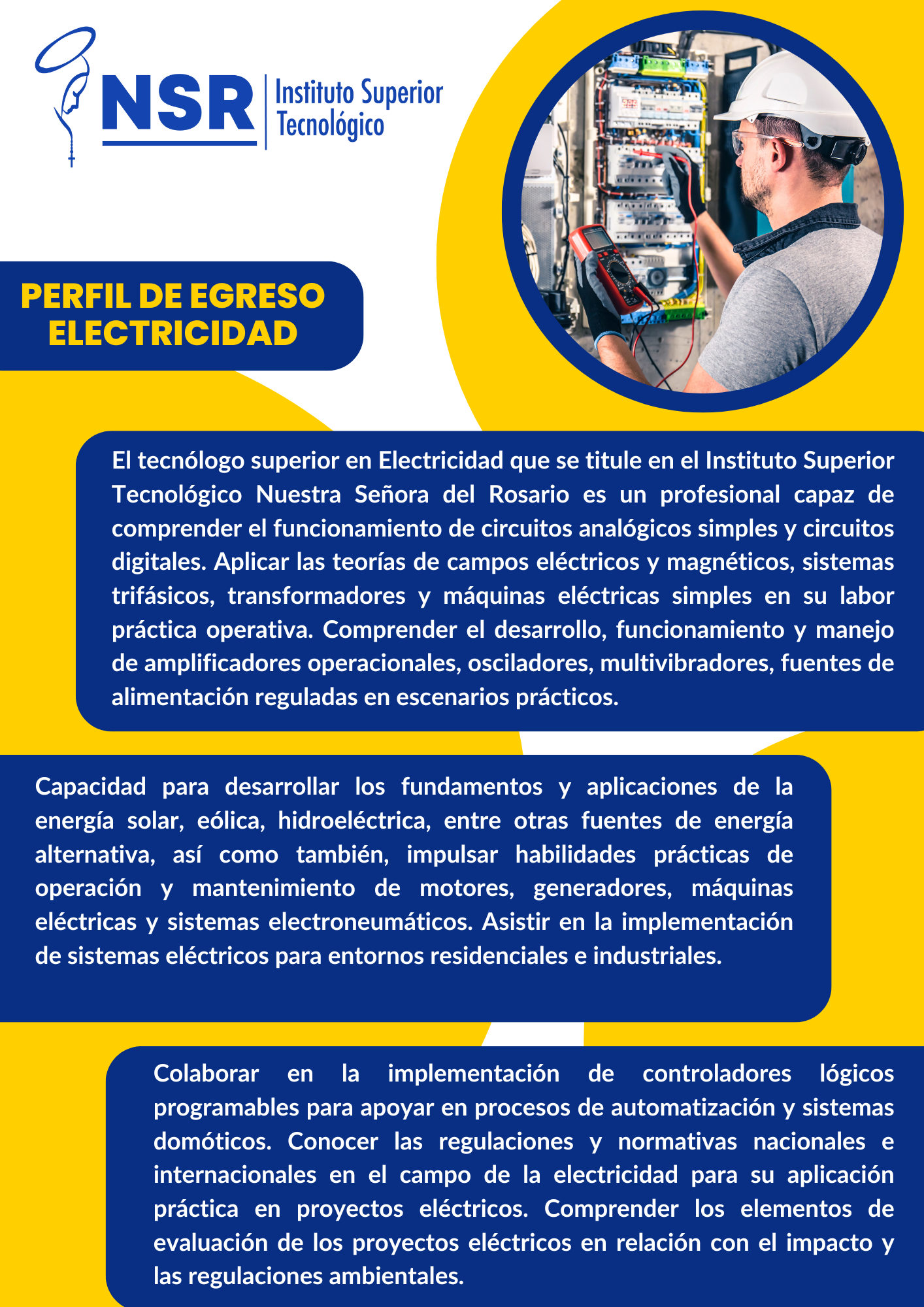 • El Tecnólogo Superior en Electricidad es un profesional capaz de configurar la operación de sistemas y operaciones eléctricas y electrónicas en edificaciones y plantas industriales con responsabilidad social y ambiental buscando incrementar la competitividad de la industria ecuatoriana y contribuir como un actor activo al cambio de la matriz productiva.